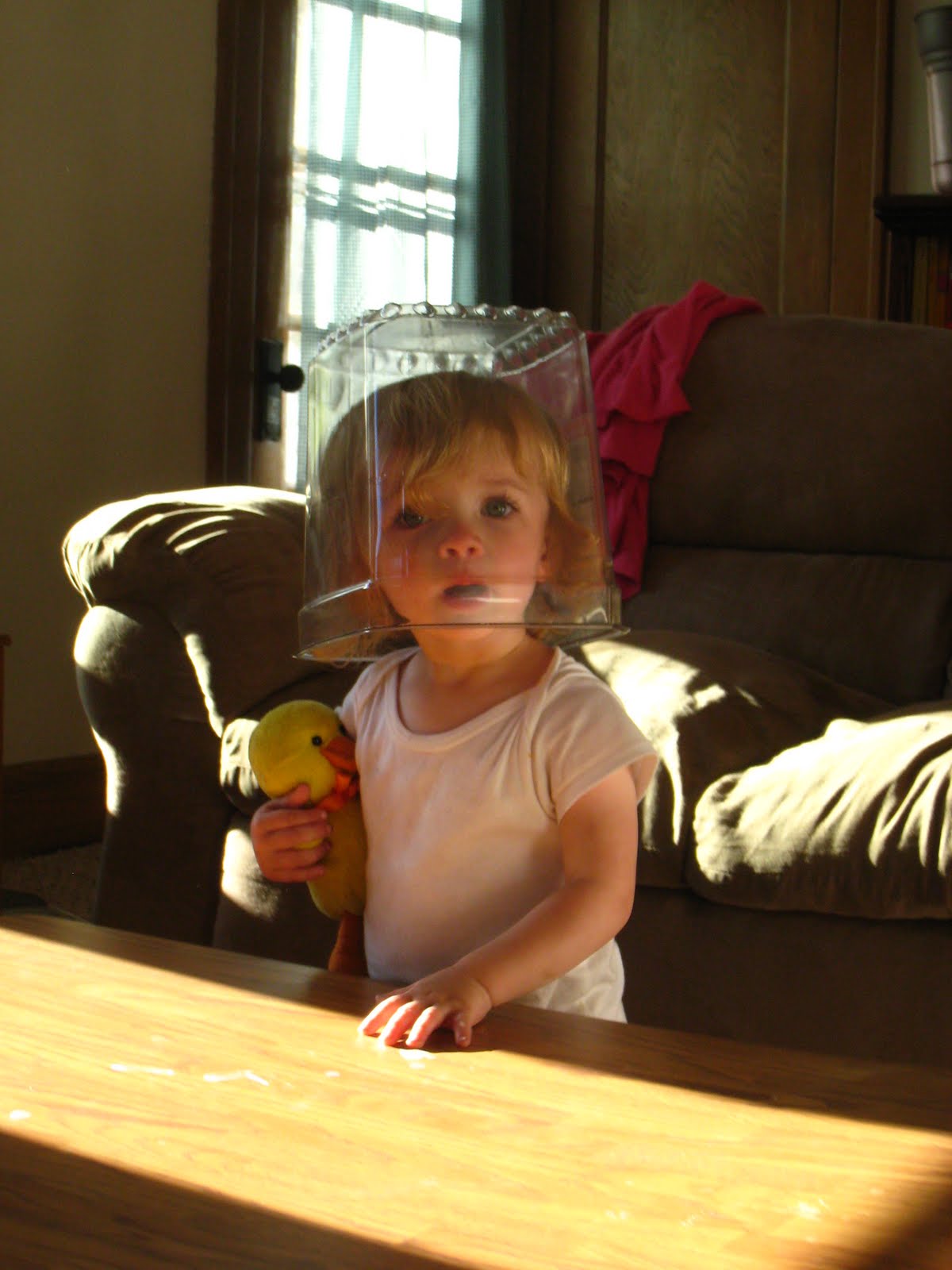 Don't think Mitch and I are bad parents for letting our kid put a bucket on her head, but she was being an "astonaut" and loving it. When she had the bucket on her head we pretended that we couldn't see her. Then she would take the bucket off and say "peek" so we could see her!